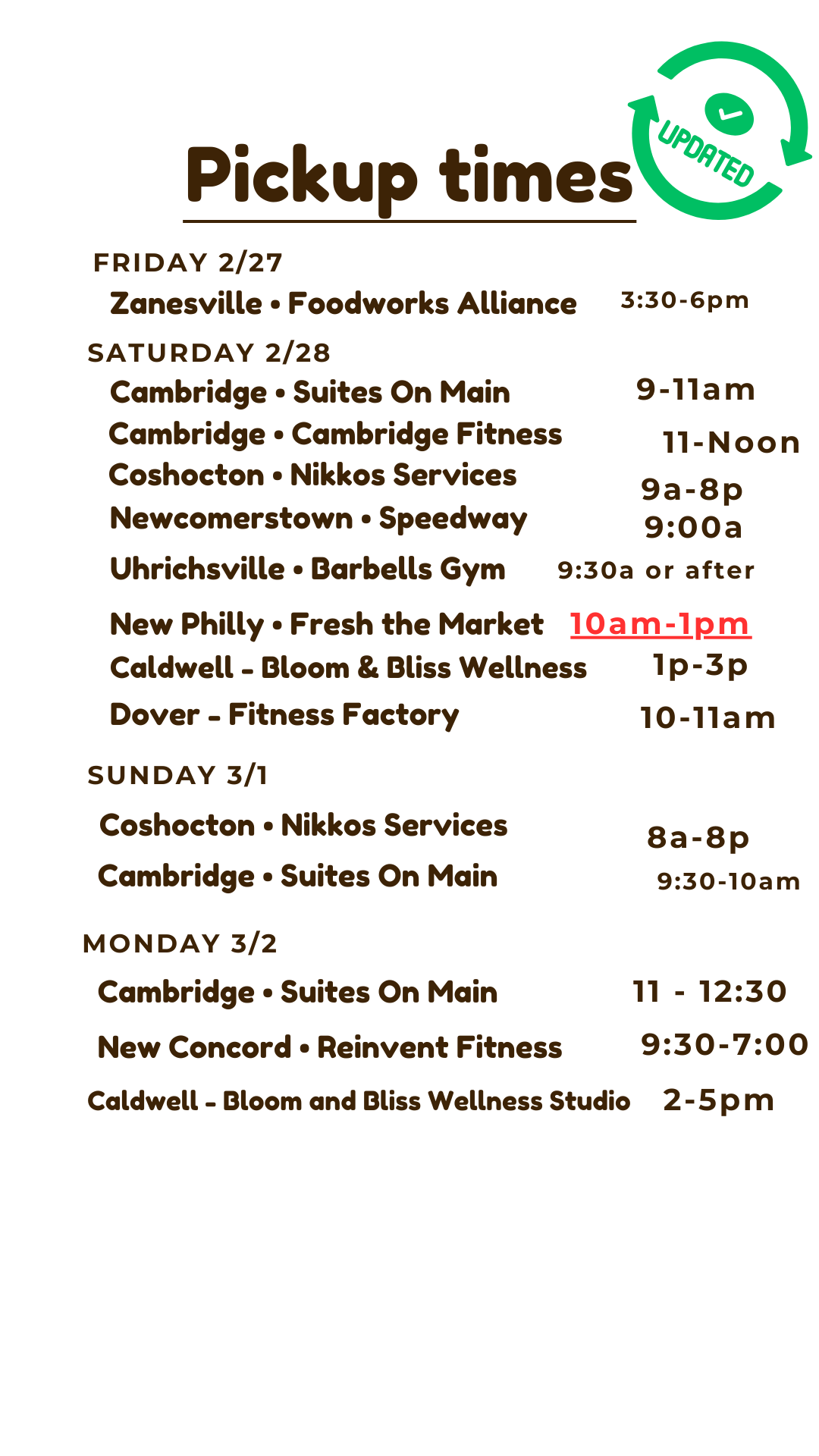 Meals will be available for pickup that same weekend. Please see pickup times and locations below for the ordering window open from 2/13-2/18